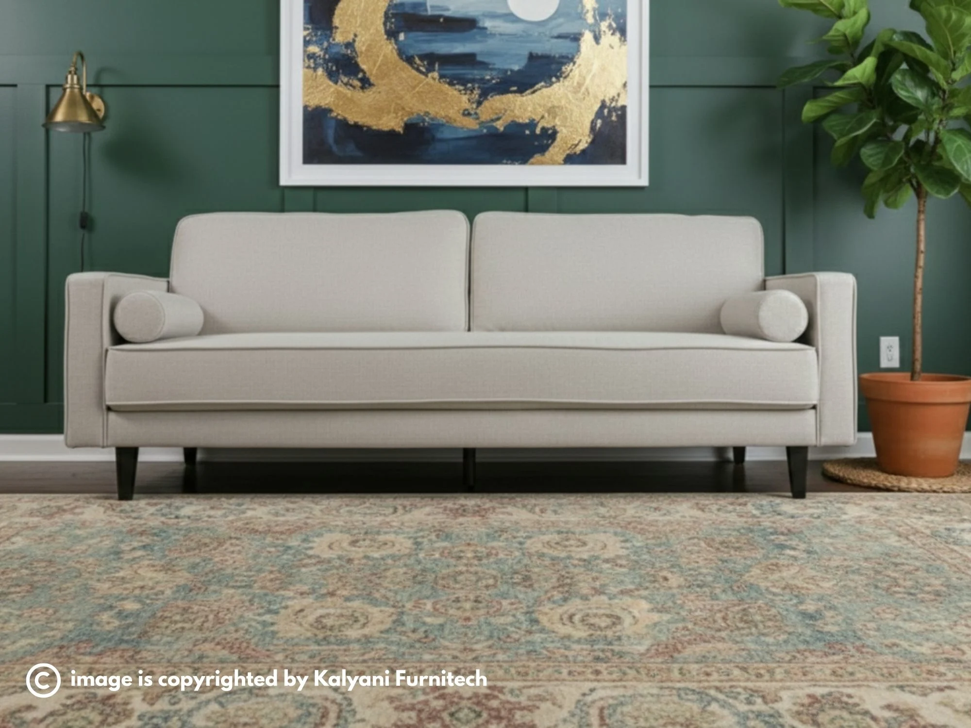 Two matching cylindrical bolster pillows are included, offering refined style and essential lumbar support for long periods of relaxation. The sofa is grounded by slender, tapered wooden legs in a dark finish, which provide a slight elevation to create an airy, open feel in your living space. Crafted with plush high-density foam cushioning, this piece is engineered for both enduring support and everyday comfort. Its durable frame and premium materials reflect a commitment to quality craftsmanship and long-lasting beauty. Whether you are entertaining guests or enjoying a quiet evening, this sofa serves as the perfect focal point for a refined living room.
