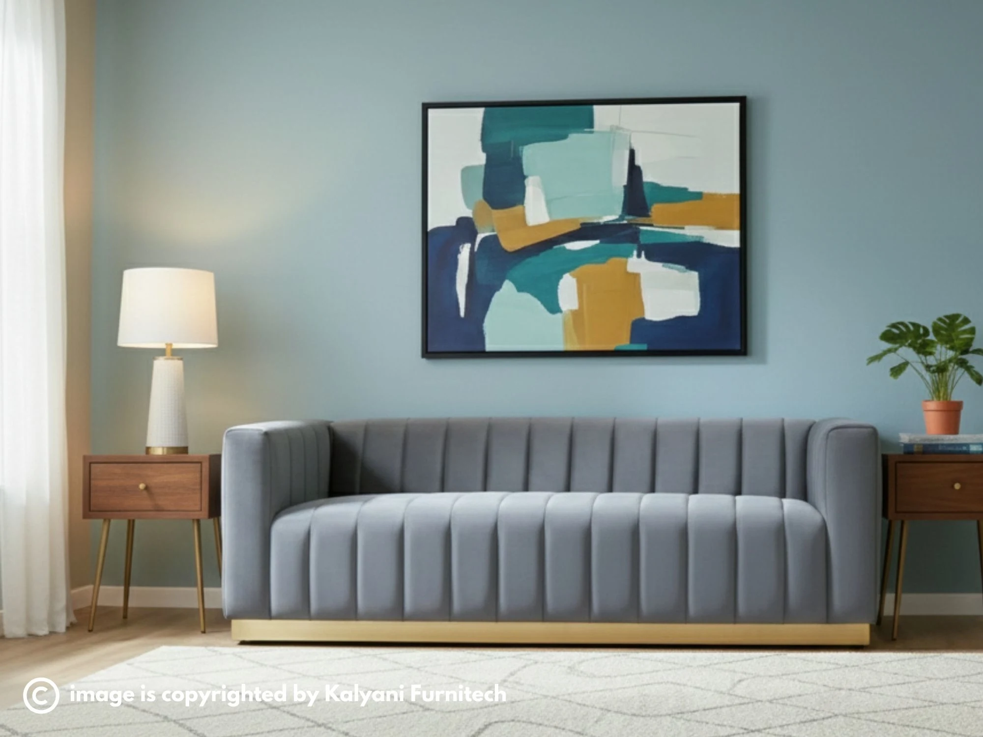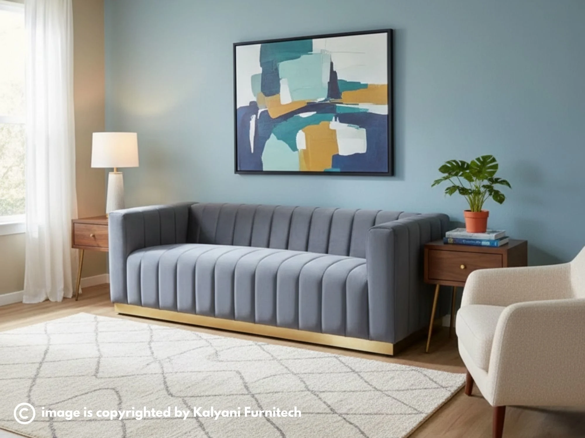 Add a touch of contemporary luxury to your home with this stunning grey velvet sofa, featuring elegant vertical channel tufting and a sleek, low-profile silhouette. The bold design is grounded by a recessed gold-finished metal base that provides a striking contrast and a sophisticated, floating look. Crafted with plush high-density cushioning, this piece offers both exceptional comfort and a refined aesthetic for any modern living space.