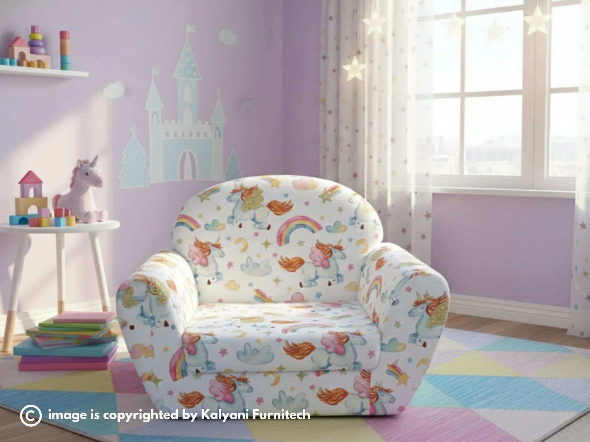 Add a touch of magic to your child’s favorite corner with this enchanting unicorn-themed armchair, perfect for kids aged 4 to 12 years. Featuring a whimsical pattern of rainbows, golden-maned unicorns, and twinkling stars, this chair is designed to spark imagination and joy in any playroom or bedroom.
