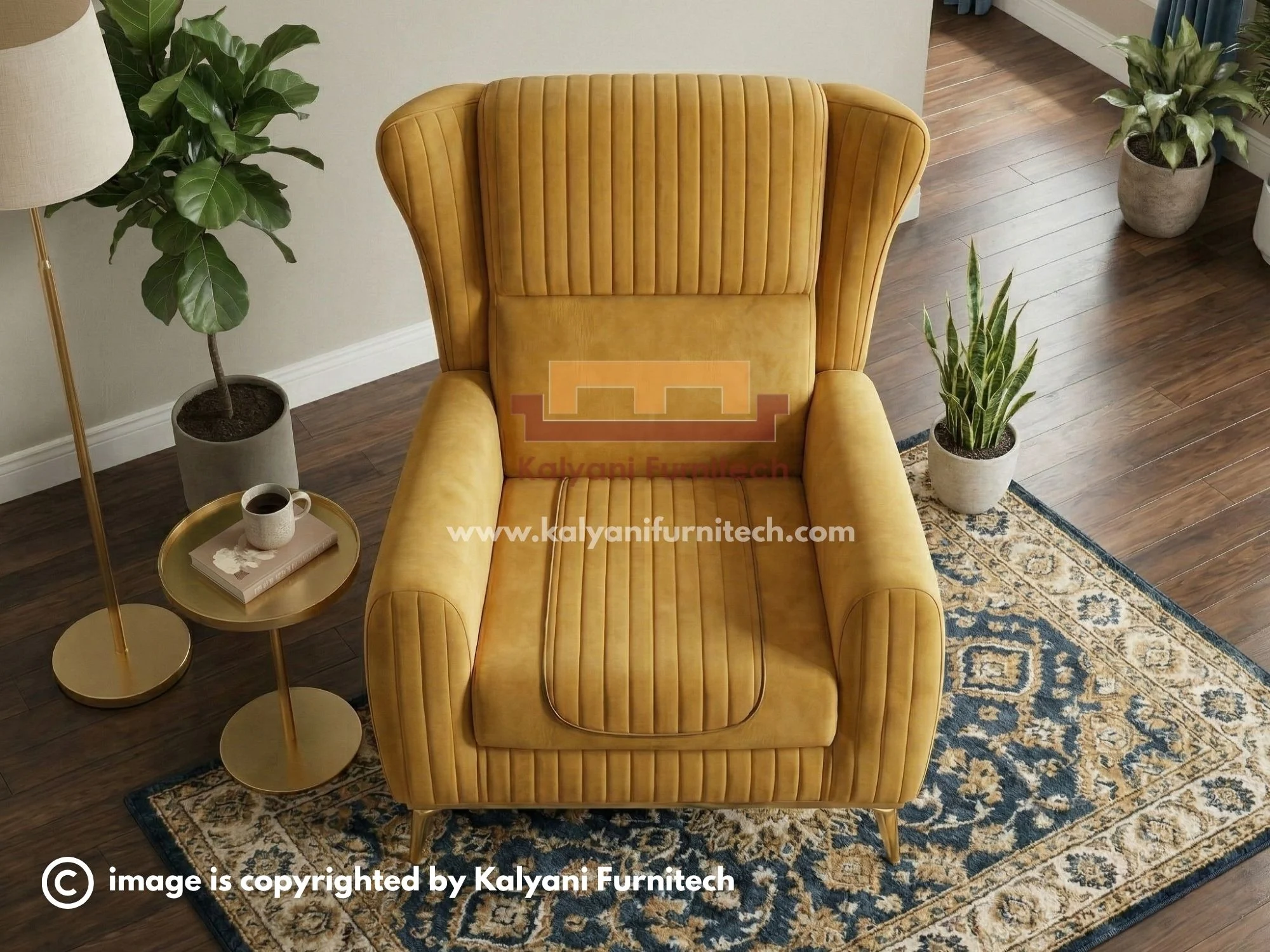 Crafted with a nod to classic royal seating, this chair features a towering wingback silhouette that provides a sense of privacy and grandeur. The rich Mustard Gold velvet upholstery is meticulously finished with vertical channel tufting, creating a textured, high-end look that catches the light beautifully.