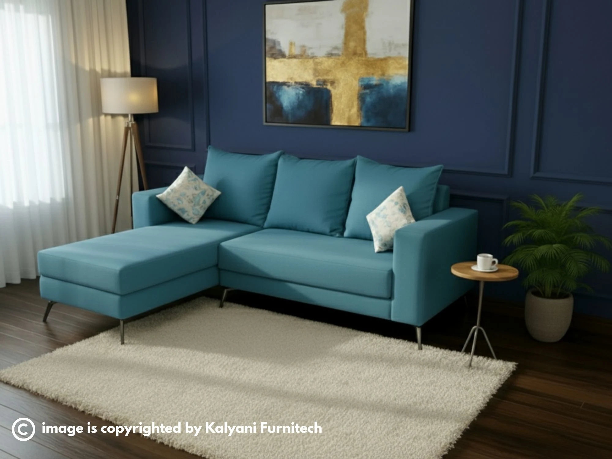 Redefine your home’s aesthetic with this sleek L-shaped lounger sofa, featuring a minimalist silhouette and vibrant teal upholstery that makes a bold statement in any room.