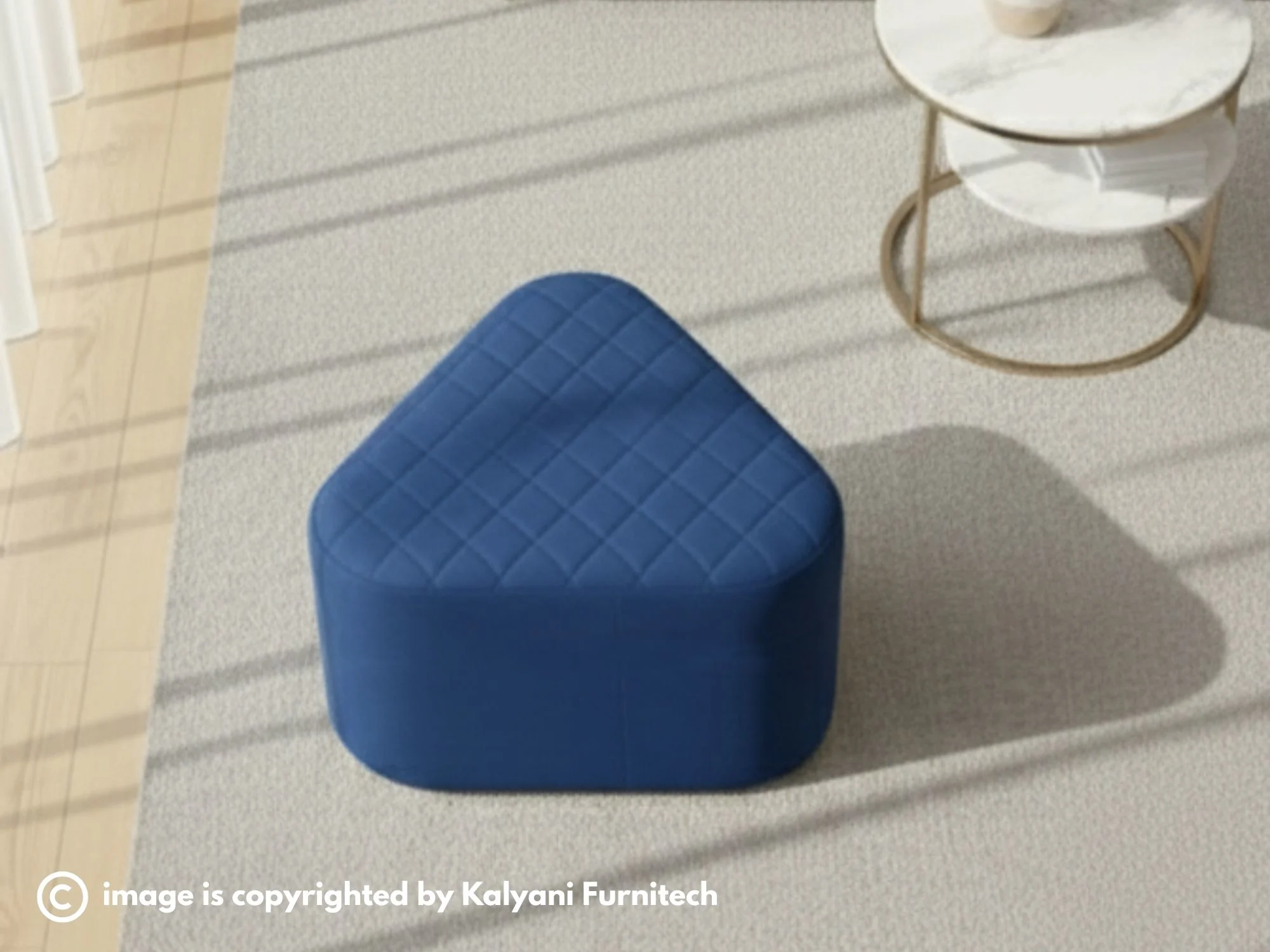 Cobalt Triangular Pouffe: A unique, soft-edged triangular design with a subtle quilted top, perfect for corner placement or as a low-profile coffee table alternative.
