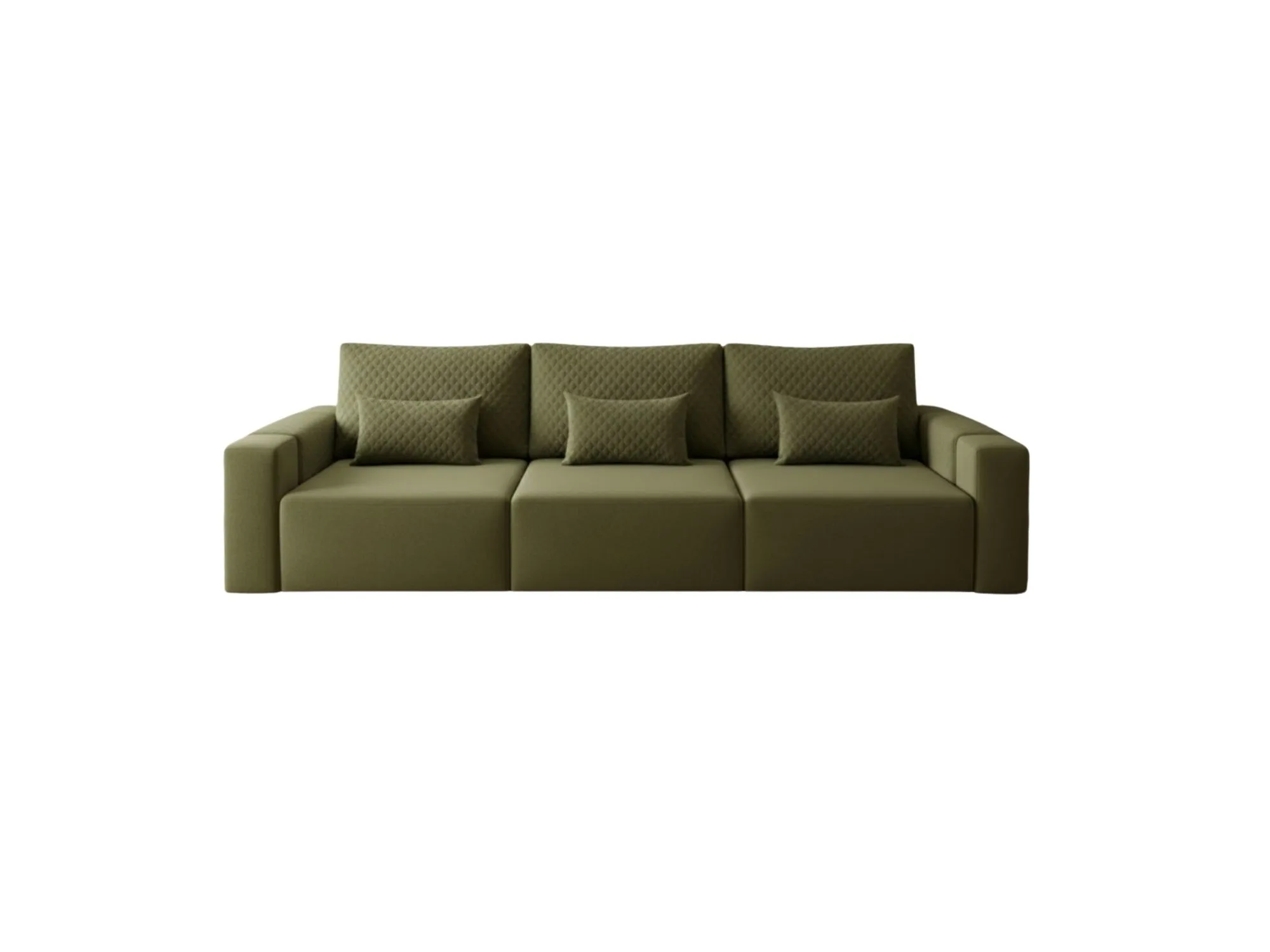 The olive green modular-style sofa provides a grounded, architectural presence with its quilted backrest detailing and matching rectangular accent pillows. Each piece is crafted with high-quality upholstery and a durable frame, seamlessly blending fashion with practical function. These spacious designs comfortably accommodate three adults, ensuring they remain an ideal centerpiece for family gatherings or formal hosting.