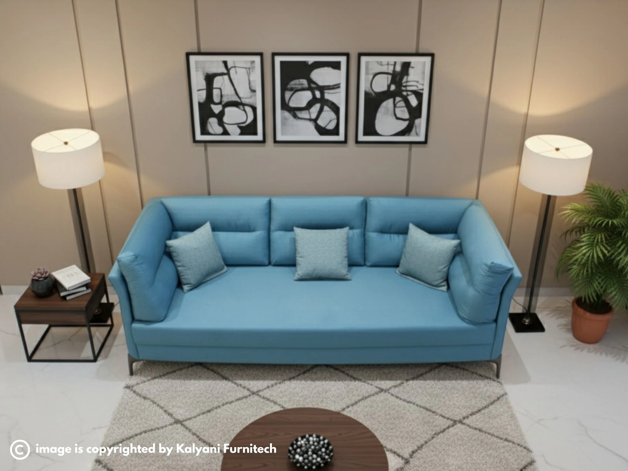 This elegant three-seater sofa features a sleek, modern silhouette upholstered in a vibrant cerulean blue fabric. Designed for both style and comfort, the sofa includes deep, plush seating and a cushioned backrest divided into three distinct sections for ergonomic support.