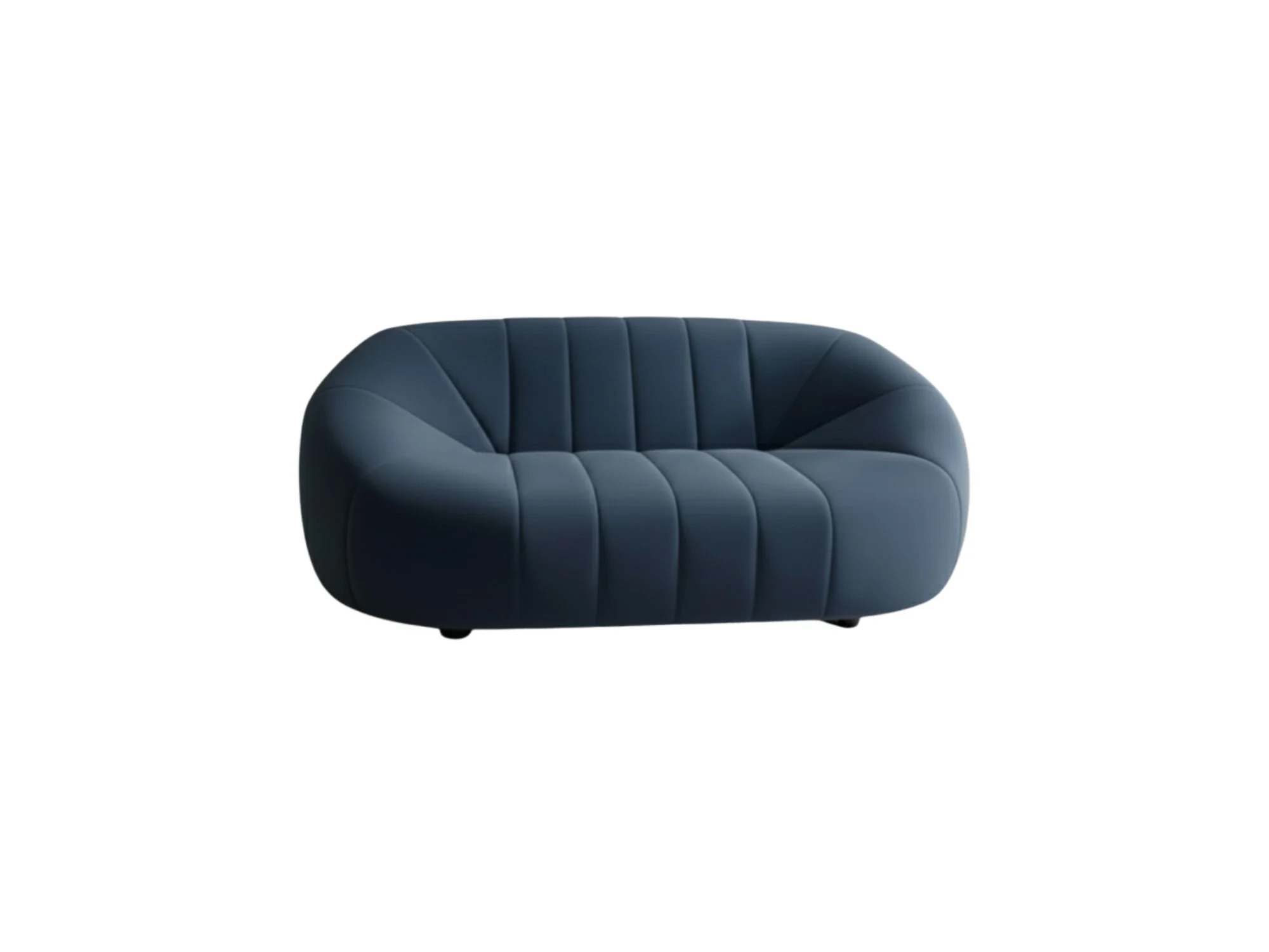 This sophisticated blue velvet sofa features a unique, rounded silhouette with deep vertical channeling that creates a modern, sculptural look. Its plush, wrap-around design offers both exceptional comfort and a bold aesthetic statement for any contemporary living space. Perfect for those seeking a blend of luxury and minimalist style, this piece elevates the ambiance of your home with its rich texture and refined craftsmanship.