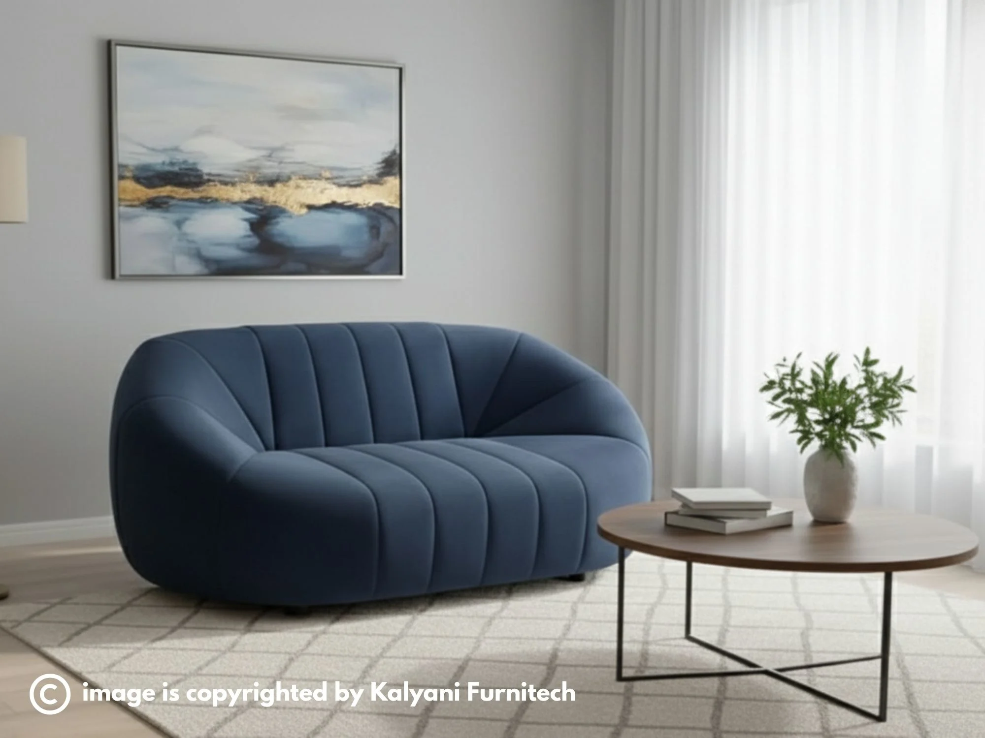 This sophisticated blue velvet sofa features a unique, rounded silhouette with deep vertical channeling that creates a modern, sculptural look. Its plush, wrap-around design offers both exceptional comfort and a bold aesthetic statement for any contemporary living space. The rich texture of the velvet upholstery provides a luxurious feel while the vibrant blue hue serves as a striking focal point. Expertly crafted with a low-profile base, this piece balances a minimalist style with refined, high-end craftsmanship.